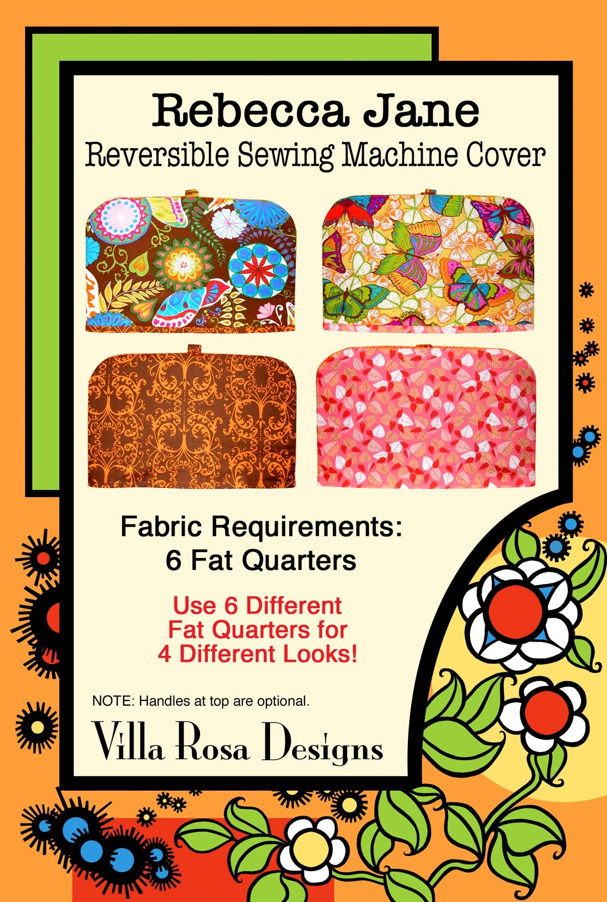 What better to sew than a sewing machine cover? This reversible sewing machine cover sewing pattern gives you the option to make a fun and custom way to keep your machine protected, all while showing off your crafty side! Included is all measurements, pictures, and instructions so making the cover is super simple. It is recommended to use 6 different fat quarters for four different looks. There is also an optional handle at the top depending on what your prefer. These make great gifts for family and friends, or just a fun project your can do and use immediately when you are finished!